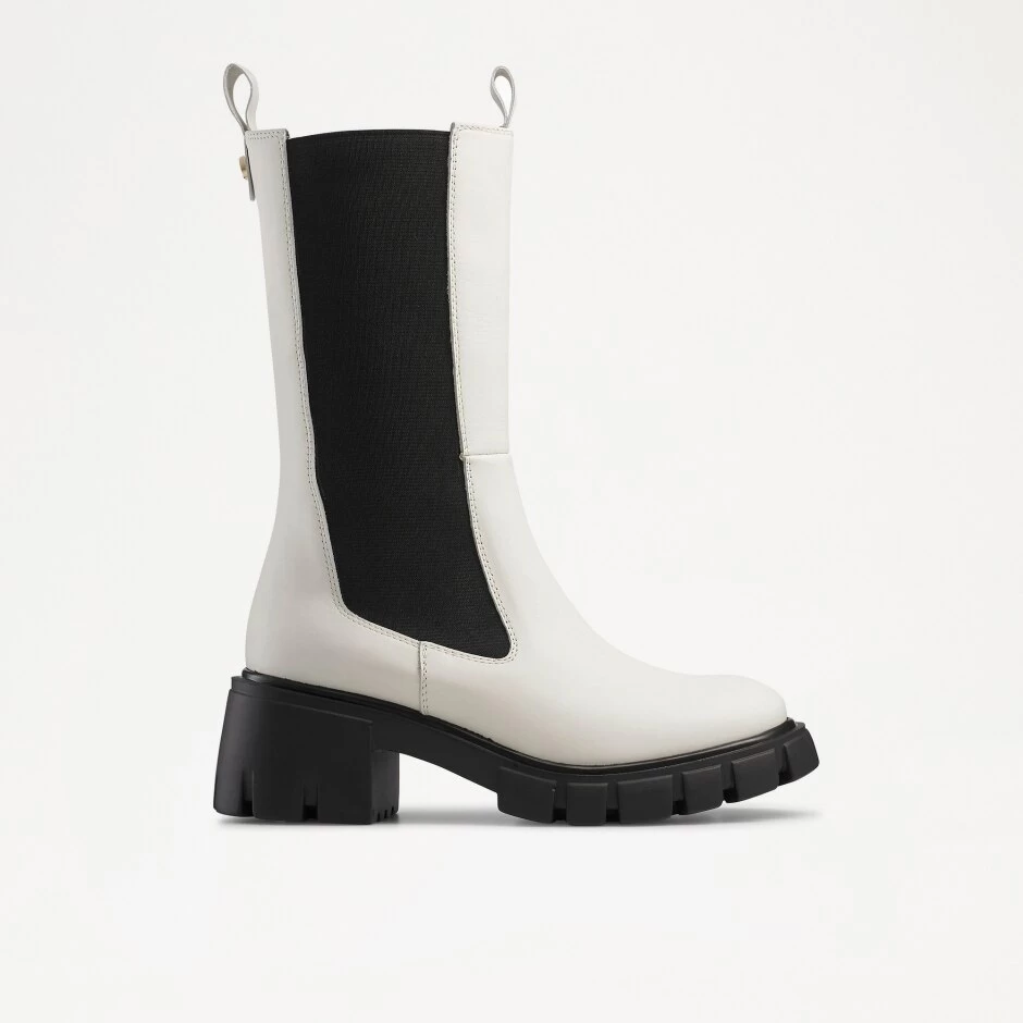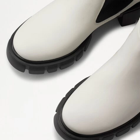 Rising in both length and height, Roundabout is the ultimate enhancement of our renowned Chelsea aesthetic. Crafted in Italy from buttery soft white calf leather this Chelsea-stomper hybrid elongates the classic elastic inserts, rising to a mid-calf length, and further elevates the silhouette by a chunky cleated sole. Finished on a wearable 6cm heel, this style offers a flattering height with both unrivalled comfort and style.