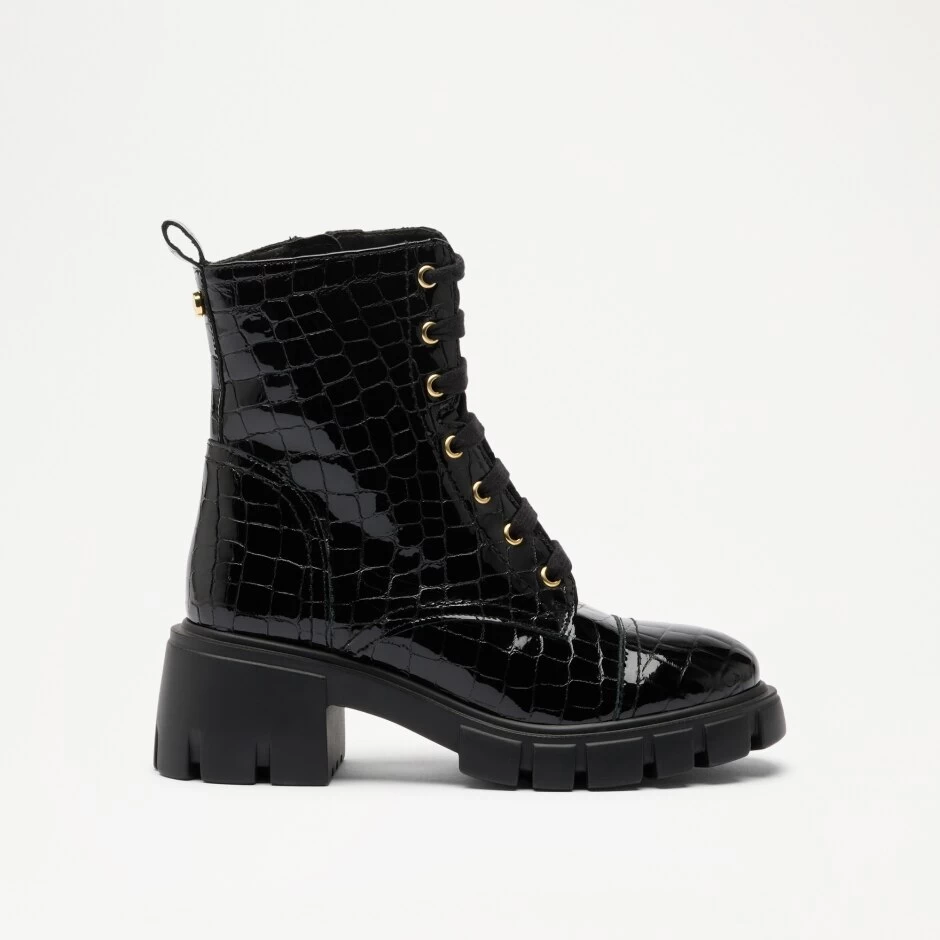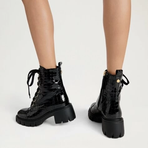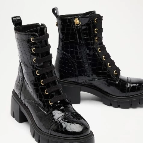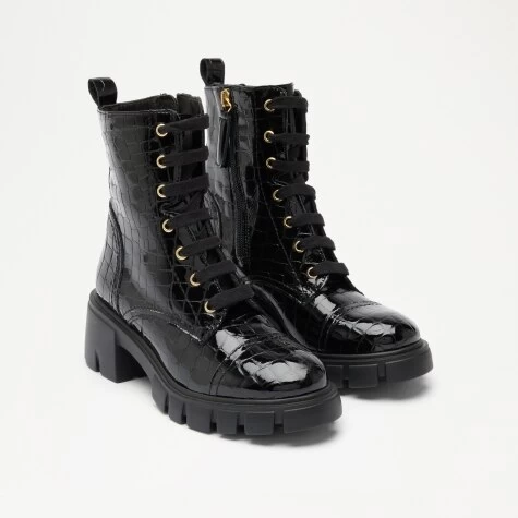 An elevated take on the rugged military boot, our heeled silhouette Laceabout will quickly earn staple status in your everyday wardrobe staple. Crafted in Italy from black printed crocodile-effect leather, this style has been detailed with a softly rounded toe, golden eyelets and a cleated block heel. Finished with both lace-up and zip fastenings, Laceabout will secure your everyday styling for seasons to come.