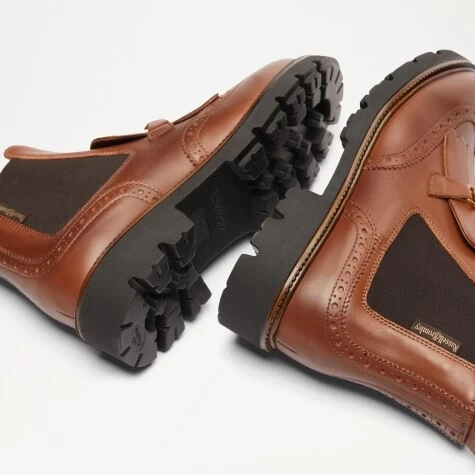 The heritage brogue boot gets a modern style shake-up with Kilty, our snaffle trim ankle boot with chunky sole. Made in Italy from tan calf leather, this daring design is inspired by our classic Icons range, but with a contemporary twist. Referencing the oversized trend with its cleated chunky sole, the piece features classic brogue detailing on the upper along with stylish snaffle details, complete with a gold metallic trim. Fully leather lined, the design also features branded logo labels and leather pull-on loops on the heel.