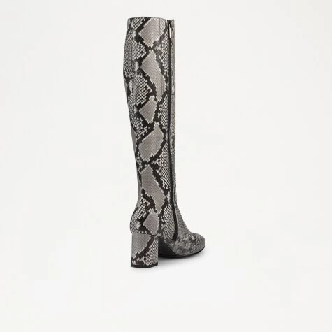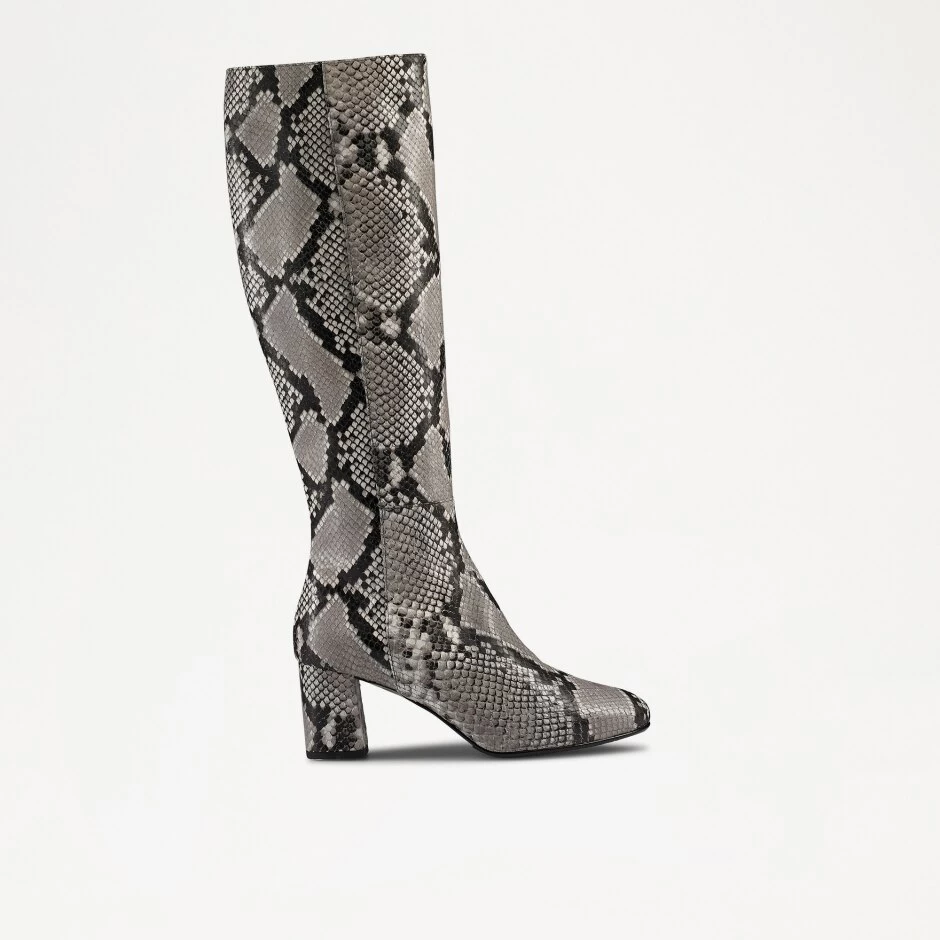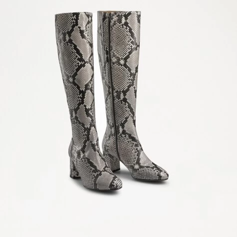 The classic block heel boot has been reinvented this season with Paris, our knee-high leather boot. Expertly crafted in Italy from exotic snake-printed leather, this signature design packs a bold style punch thanks to its monochrome colourway and wild pattern. The design features a stitch detail side vent and full-length zip fastening for effortless wearability. Featuring a rounded toe and elevated block heel, this versatile style can be dressed up for stylish events, or pared down with slim jeans for a laidback look. *Slim leg fit.