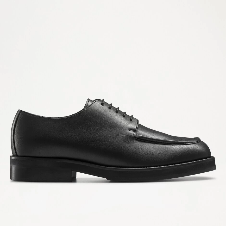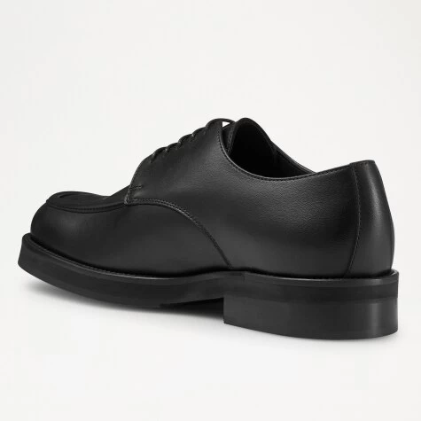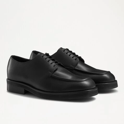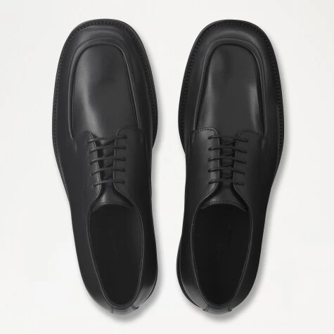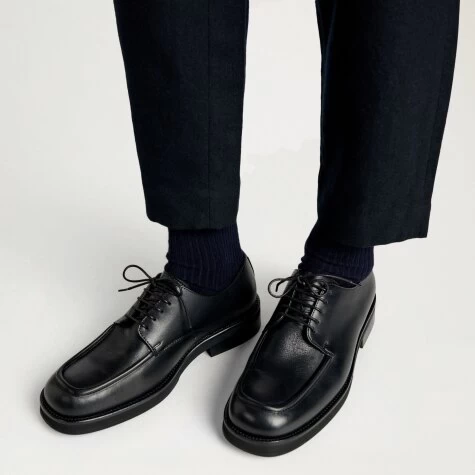 Faro offers a classic apron derby silhouette, but with a refreshed square-toe shape. Crafted in Italy from smooth black leather, this versatile style is distinguished by its bold square toe, a key trending shoe shape of the season. The design features visible welt stitching and specialised leather soles overlaid with a rubber insert for superior durability.
