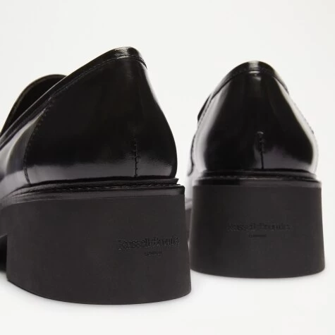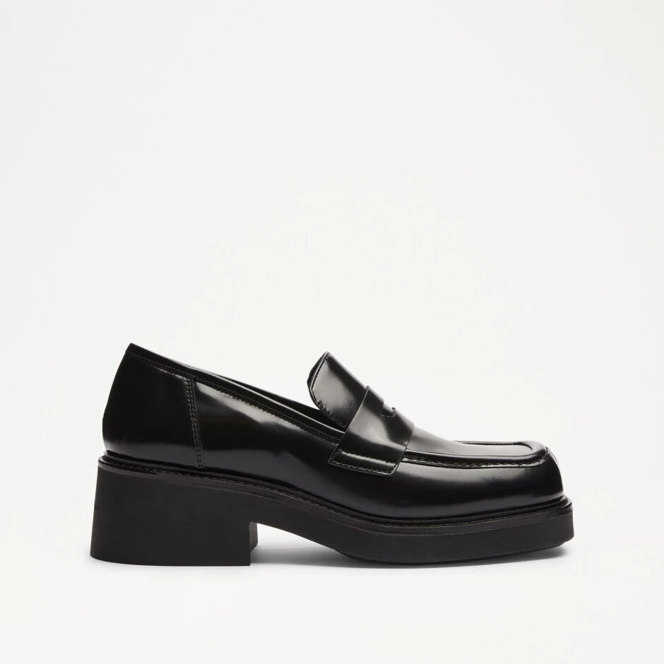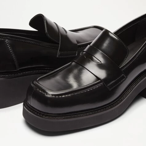 Embracing this season’s signature square-toe shape, Solo is a leather loafer with a casual feel and high-shine finish. Crafted in Italy from dyed black calf leather, the design features traditional penny loafer detailing across the vamp complete with double stitch accents. Tubular piping and a raised rubber sole round off this highly versatile piece. Fuse it with anything from skinny jeans to trousers or your best event-ready skirts.