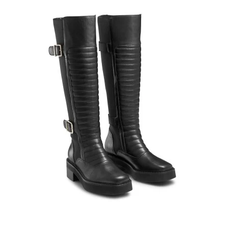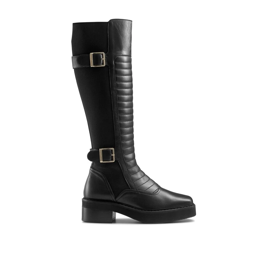 Pillion Hi offers a luxurious extension of the classic biker boot silhouette. Crafted from buttery-soft nappa leather this extended iteration has been enhanced by puffy ribbed panelling, a double buckle trim and an extreme square toe. Boasting comfort at the forefront, an extended elasticated gusset along the back allows the boot to be pulled on and off with ease whilst a chunky cleated sole promises durability through seasons to come.