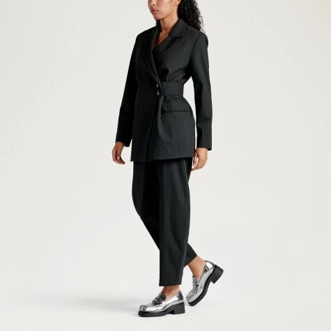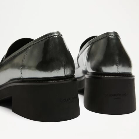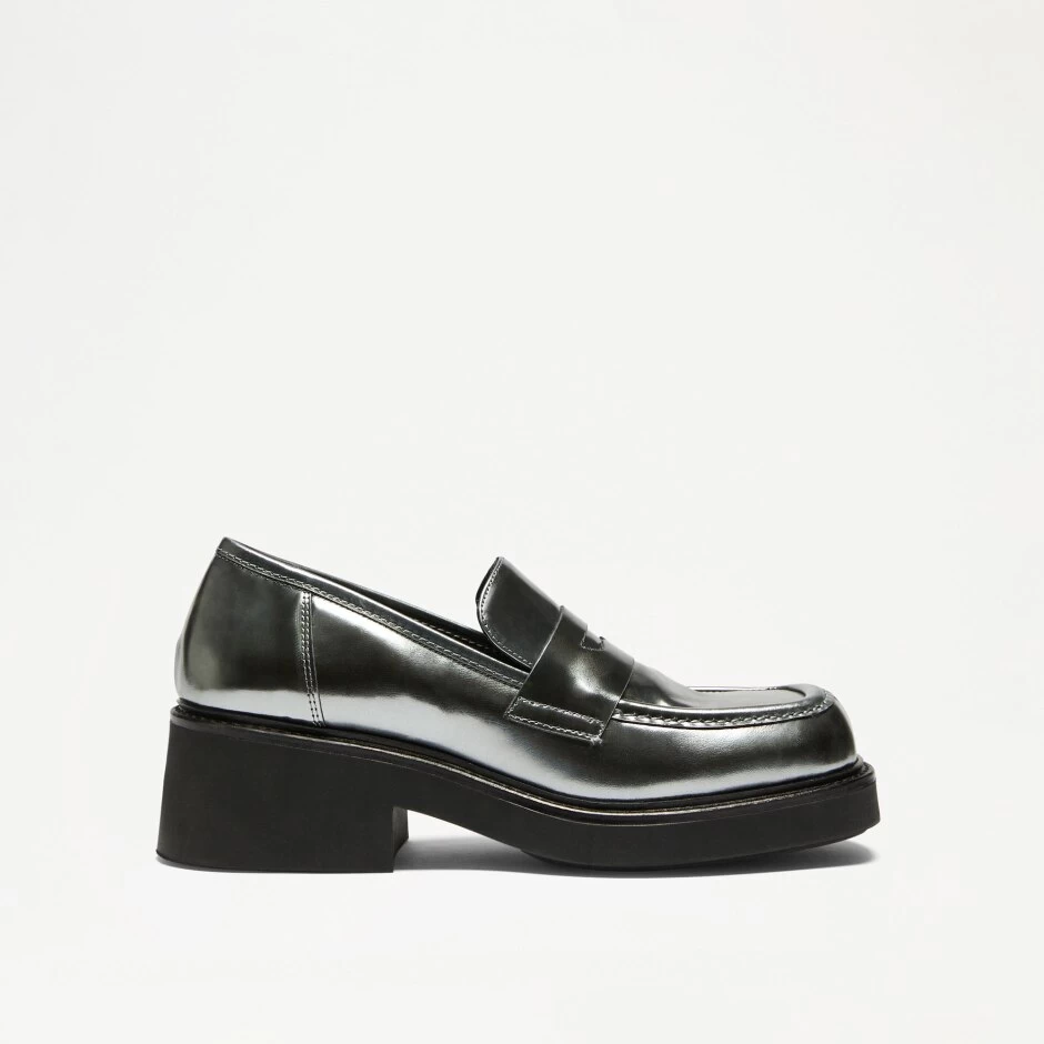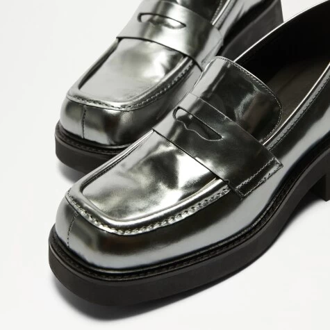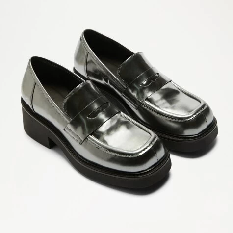 Embracing this season’s signature square-toe shape, Solo is a leather loafer with a casual feel and metallic high-shine finish. Crafted in Italy from dazzling pewter-hued calf leather, the design features traditional penny loafer detailing across the vamp complete with double stitch accents. Tubular piping and a raised rubber sole round off this highly versatile piece. Fuse it with anything from skinny jeans to trousers or your best event-ready skirts.
