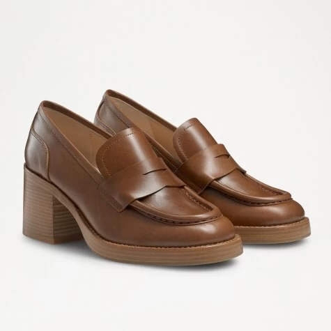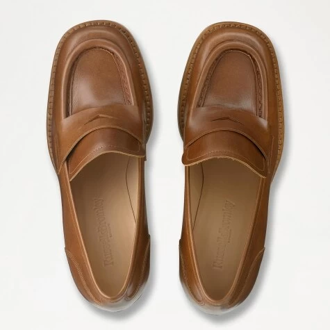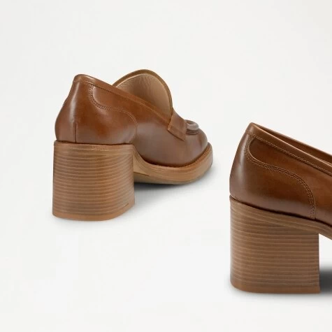 Disco styling and British heritage intertwine perfectly with Stacked, our bold leather block heel loafer. Made in Italy from waxed tan calf leather, this statement style uses a traditional loafer silhouette, but revamps it by placing it on a 70s-inspired retro wood-stacked heel. The style is fully leather lined and perfectly primed for dancefloors and everyday dressing alike.