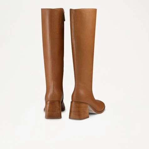 A smooth iteration of the classic long tan boot, Twiggy is an effortless way to wear the 70’s trend. Crafted in Italy from smooth tan leather with shaping inspired by the classic riding boots of South America, this knee-high boot is an effortless addition to autumn styling. Set on a natural stacked block heel with a softly rounded toe and centre seam detail, this timeless design offers a vintage aesthetic with a perfectly modern touch.