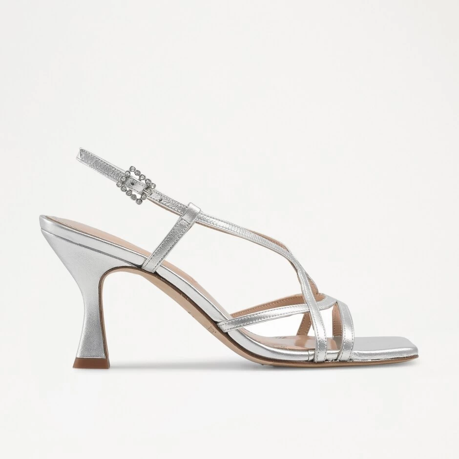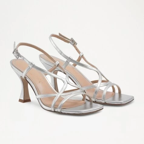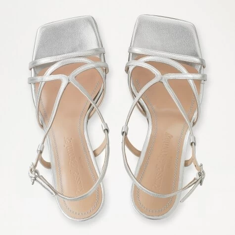 Prosecco effortlessly fuses the fisherman trend with the ever-trending heeled sandal. A seek, strappy silhouette with a contemporary flair, this style has been crafted from thin strands of smooth silver calf leather formed into a fisherman-inspired pattern that culminates with a secure ankle strap. Lacquered to prevent scuffs and marks, a vintage-inspired cylinder heel has been complimented with a statement square toe, presenting a geometric design that is set to be the shape of the season.