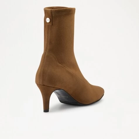 This season the streamlined sock boot is back, meet Hot Sox. Crafted in Italy from rich tan stretch suede that rises just above the ankle, this sleek elongated silhouette hugs close to the leg offering a flattering effect. From the elegant heel to the softly pointed toe, effortlessly style the sock boot trend for a multitude of occasions with Hot Sox.