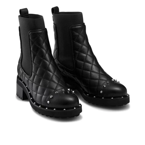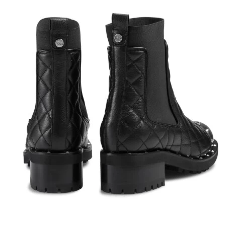 Dressed in an array of decedent details, Firecracker offers an elegant twist on our iconic Chelsea silhouette. Crafted in Italy from quilted black calf leather, this statement style has been further enhanced by a silver studded trim, smooth leather toe cap and comfortably risen heel. Finished with an extended elasticated sock and functional pull tabs inspired by the classic Chelsea boot, pull on and off ease and take on the everyday in style.