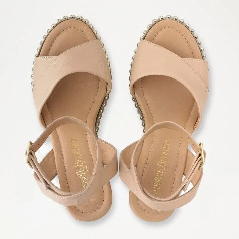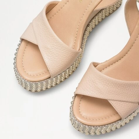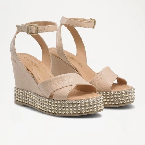 Get the party started in Sunkiss. Crafted from Italian blush-pink calf leather, the criss-cross strap detail and ankle strap guarantee a secure feel, whilst the gold studded wedge guarantees elevated style. Made to be worn late into the night, Sunkiss deserves to be seen.