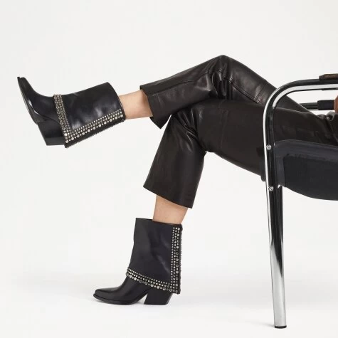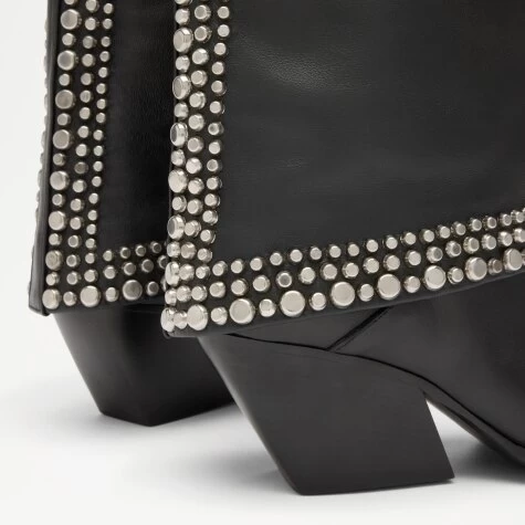 Add a grunge edge to the cowgirl look with Dolly, our metallic studded mid-calf ankle boot. Crafted from the finest black nappa leather, this head-turning design makes a rock ‘n’ roll statement with its high-shine spiky studs and pointed toe. Complete with a sturdy and comfortable angular heel for extra style points, it suits any event, from heady nights out to summer festivals.