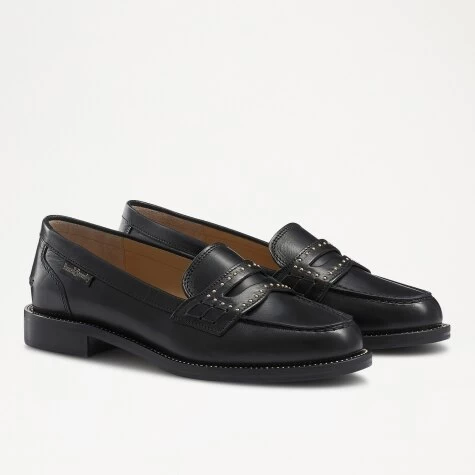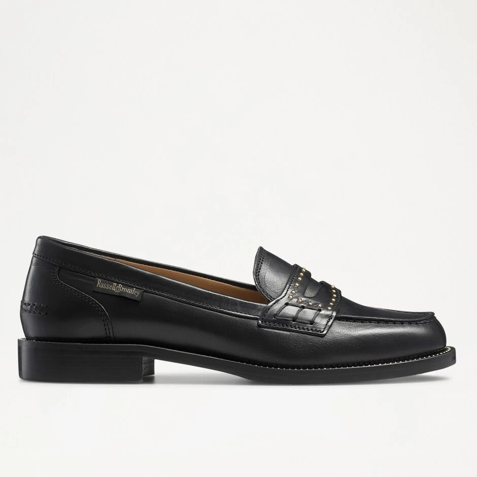 Inspired by our bestselling loafer icons, Victoria is a reworked leather penny loafer complete with glamorous gold studs. Crafted in Italy from supple black calf leather, this timeless studded loafer is the go-to shoe for everyday practicality with a touch of fashion-forward fun. Fully leather lined, it features gold stud detailing on the welt and saddle and a fabric logo feature, while being set on a hardwearing sole.
