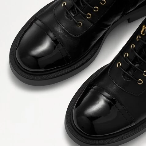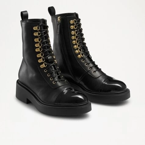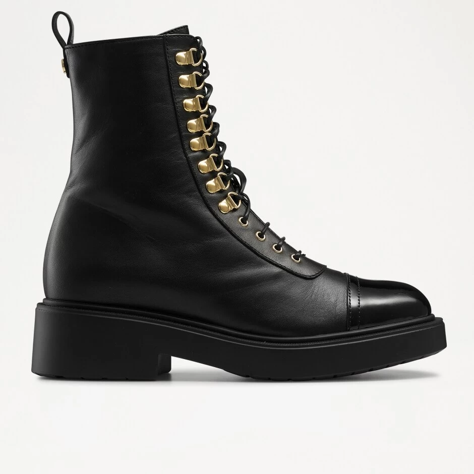 Lightning is a meticulously detailed take on the classic military boot. Crafted from black buttery soft calf leather, this chic lace-up design has been detailed with statement gold eyelets, thin leather lacing and a high-shine polished toe cap. Super lightweight and durable, this style offers staple status for an array of occasions.