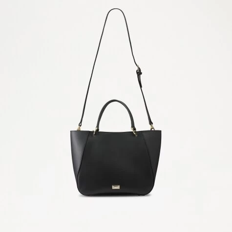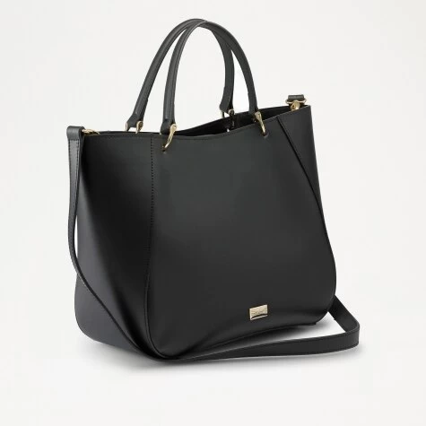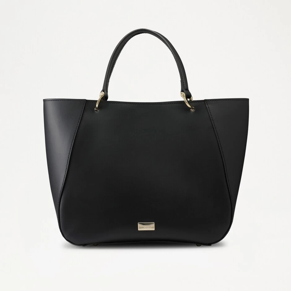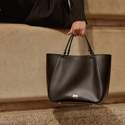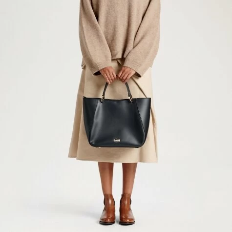Inspired by Woody, our everyday top handle bag, Florentina is a contemporary update thanks to its intriguing trapeze-effect shape. Carefully constructed in Italy from sturdy black calf leather, this casual top handle bag features a trapeze-shaped panel that is accentuated by its attached leather top handles. It comes with glossy gold hardware, a natural textile lining and discreet inside leather patch complete with debossed logo branding.