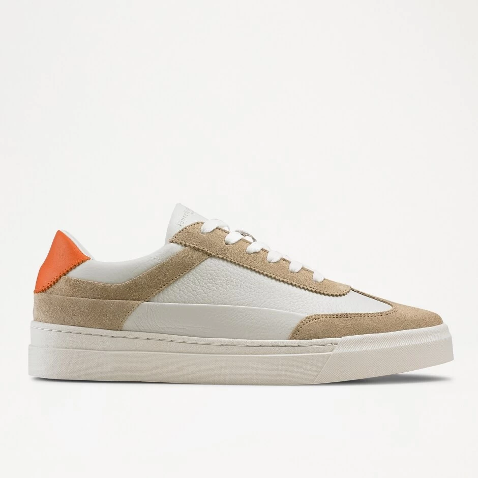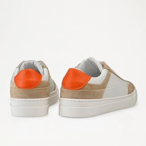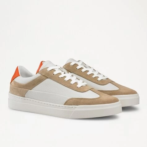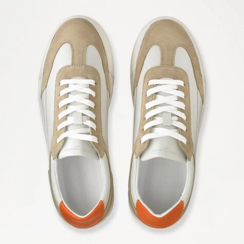 Opt for sleek design with a retro throwback feel with Belmont, the leather and suede sneaker with a classic vintage feel. Crafted in Portugal, it features a grained leather upper that comes in an off-white hue, and is artfully finished off with beige suede panels and a red heel accent. The effect is a sneaker that works equally well for off-duty weekend jaunts, or making a statement with occasion dressing.