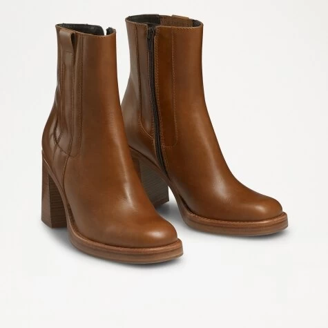 A sleek take on the trending wood-stacked heel boot, Pallomini will see you through seasons to come. Crafted from tan calf leather, this rustic design has been detailed with both a pull tab on one side and a contrasting dark brown zip on the other. Finished on a light tan stacked platform heel, this elevated ankle boot both evokes 70’s styling and the boho aesthetic with an easy-to-wear design that will walk you through the seasons.