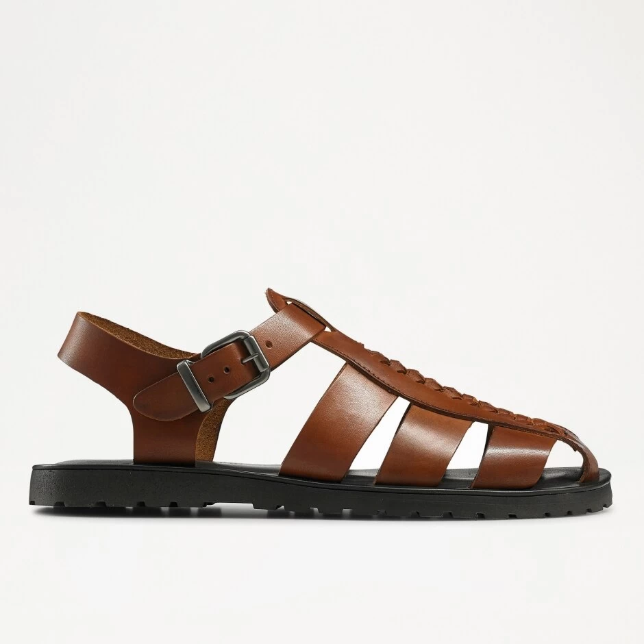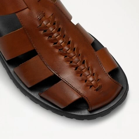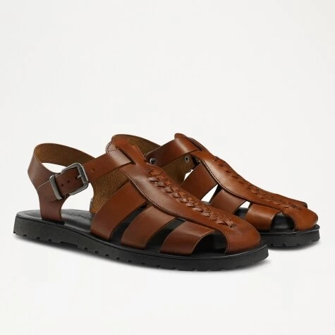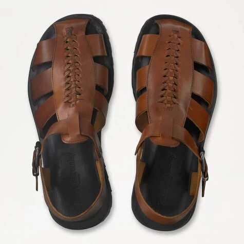 King Fisher is a luxurious way to wear the fisherman sandal trend. Starting life in Italy, this rustic style has been handcrafted from buttery soft brown calf leather, complete with fine woven detailing along the upper and culminating with a closed-toe design. Finished with a full leather sole in contrasting black leather and fastened by a sleek silver buckle fastening, confidently hop from beach to bar with this breathable pair.